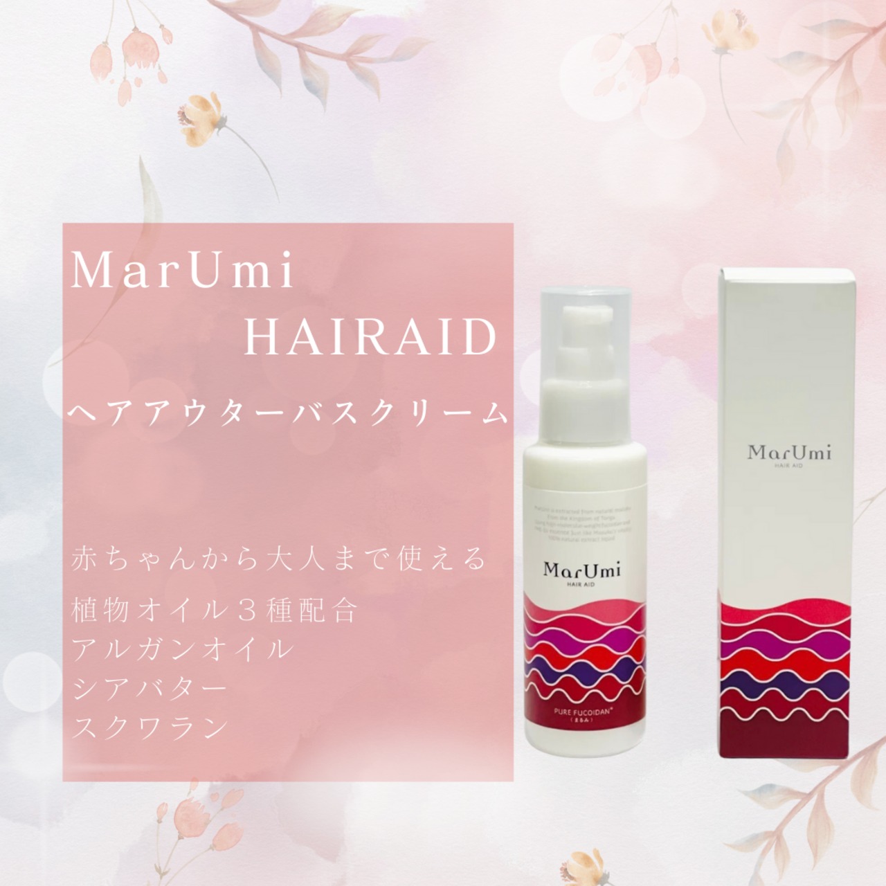 MarUmiヘアエイドは、天然由来の2つのフコイダンが傷んだ髪を強力に保護、補修する高機能アウトバスクリームです。