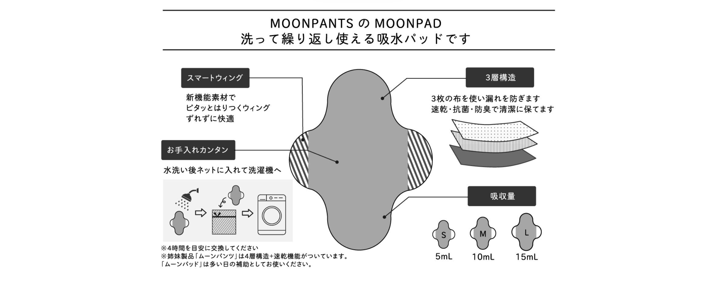 3枚の特殊な布を使い漏れを防ぐムーンパッド。
